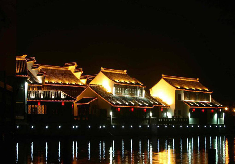 古建筑照明项目中使用的主要表现手法。古建筑不宜过多表现建筑的细节,应该表现建筑的大面,而不是现在所谓的‘逢柱必打,逢线必勾’。因为中国建筑中有太多雕梁画栋的细节,如果每个都要细细照亮,灯具难以全部隐藏,我们只需将建筑本身的体量表现出来即可。透过不同的灯光强度,产生光影对比,使其在夜间自然产生‘立体感’,进而塑造整体的夜间氛围。